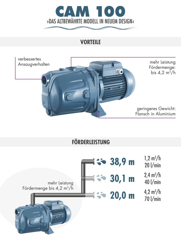 Notre modèle de pompe CAM 100, qui a fait ses preuves depuis longtemps, se présente désormais dans un nouveau design.